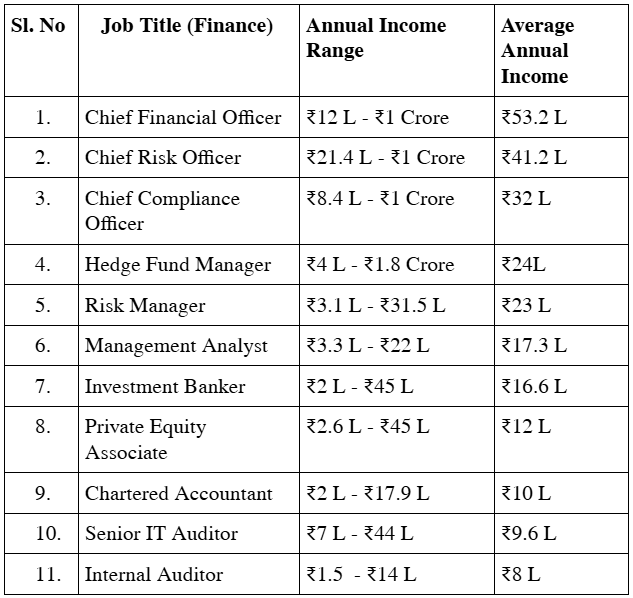 Here is a table that gives you an insight into the various finance job titles and their respective average income and range.